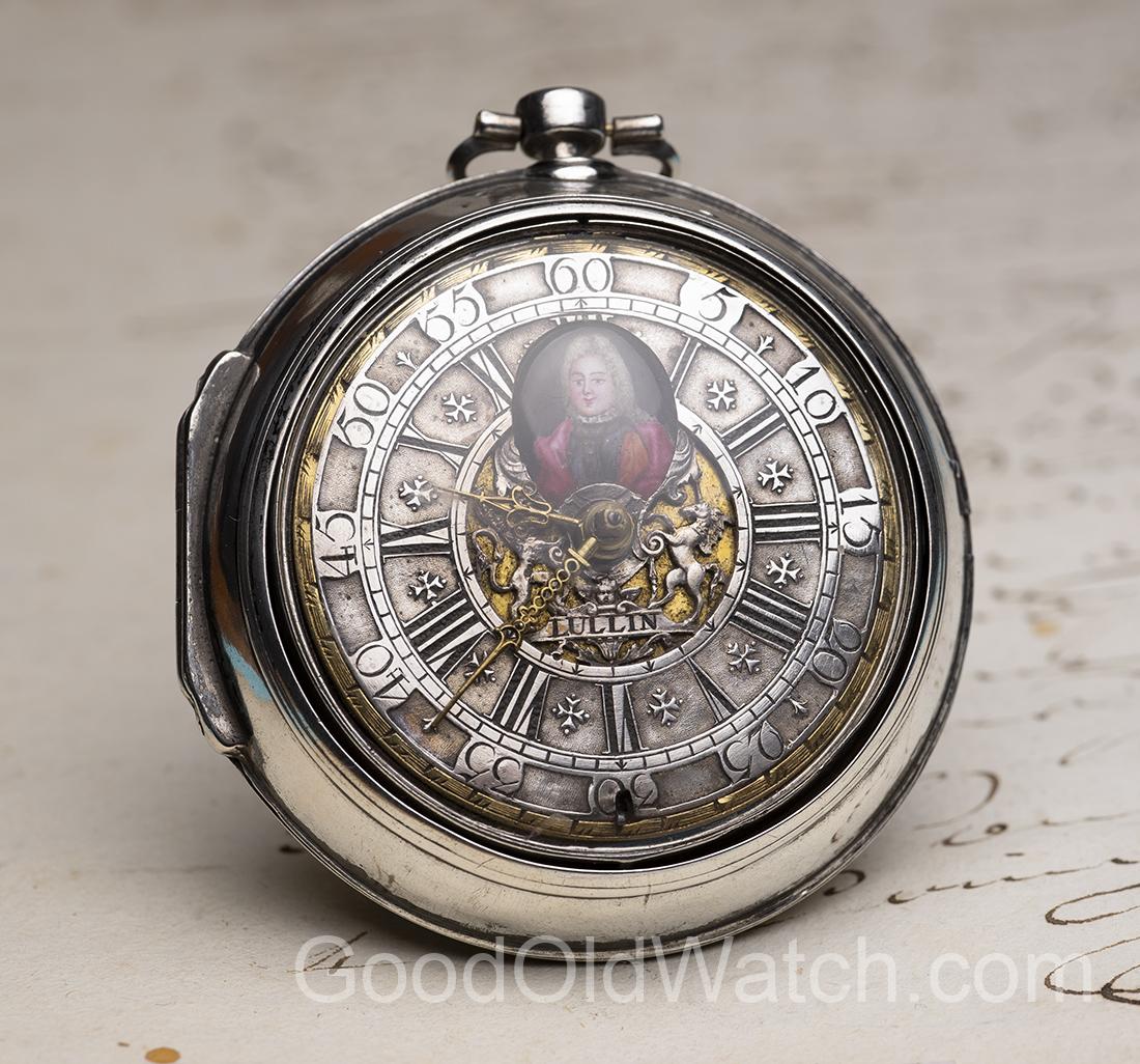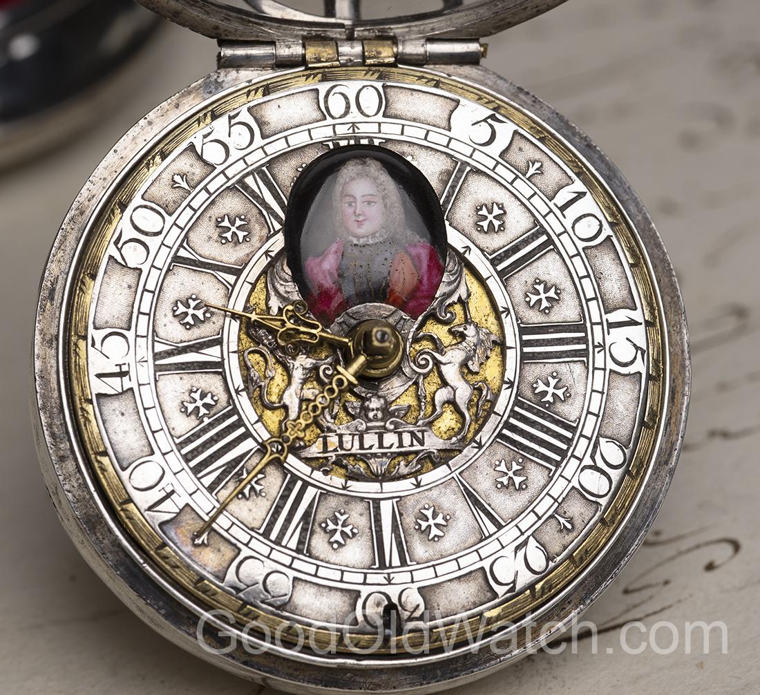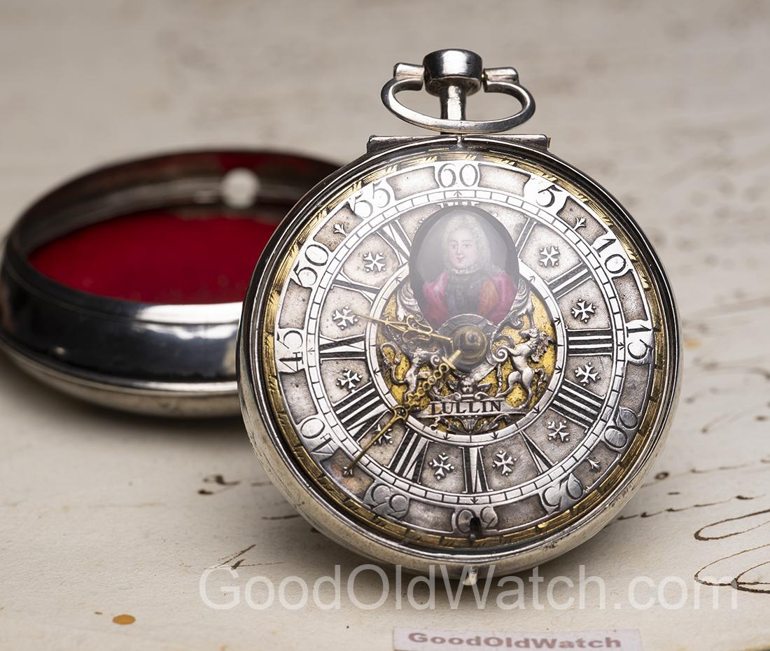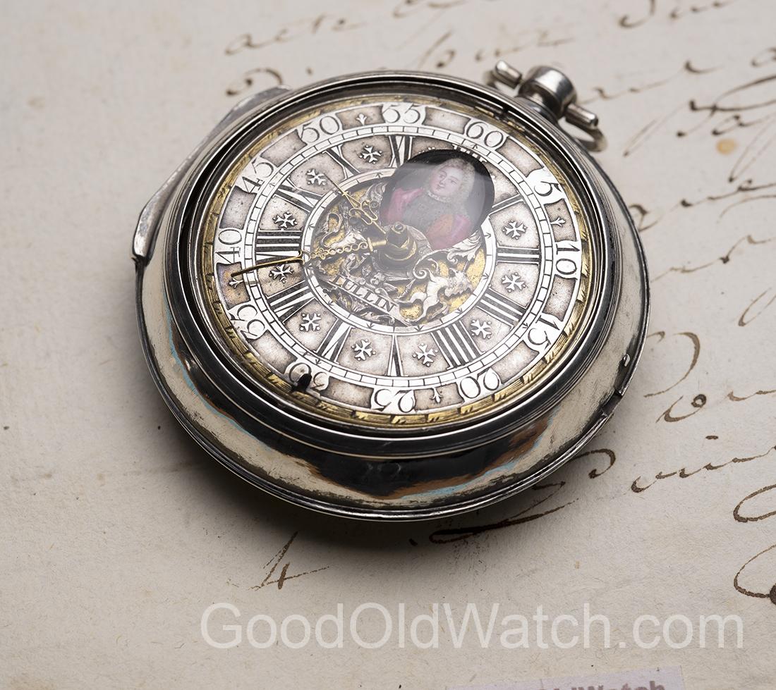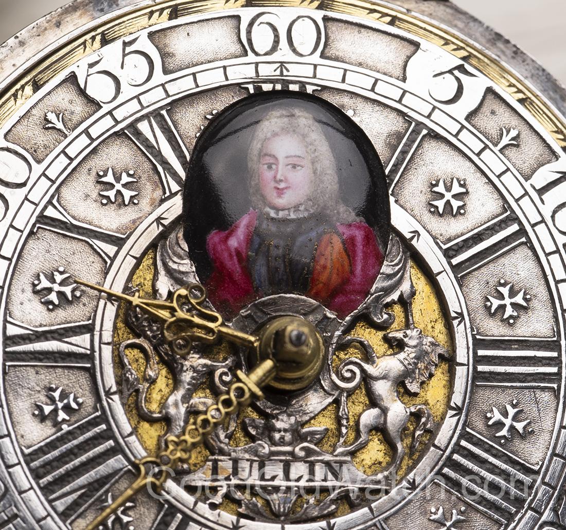 Watch features the portrait of man in red tunic, over the English coat of arms - should be portrait of William III of England.