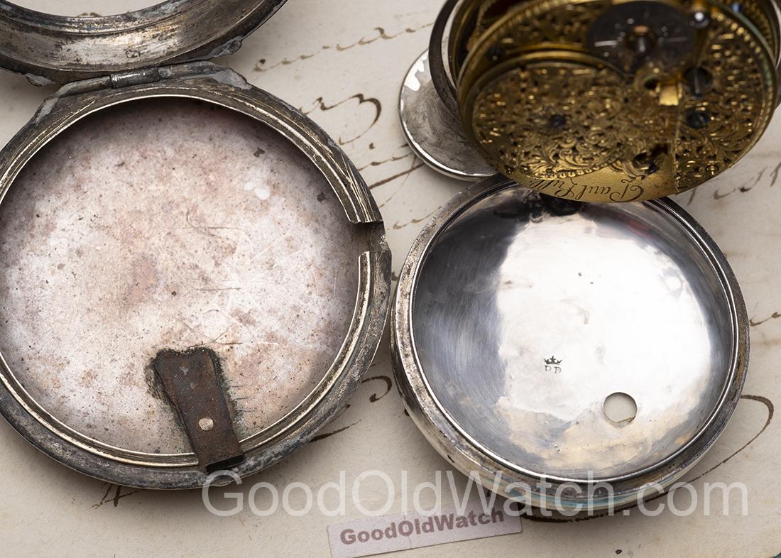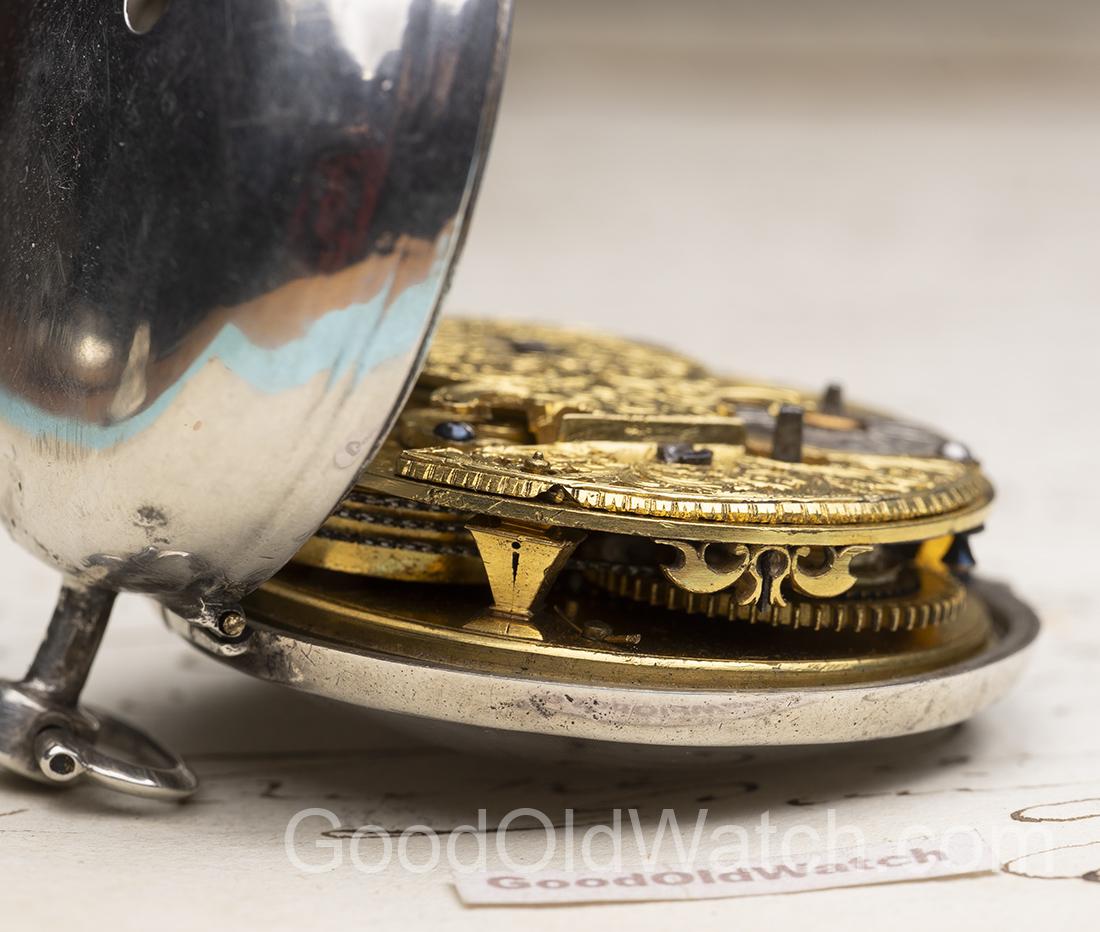 The watch on sale is made in English style of early XVIII - it features beautiful cock of symmetrical design with nice grotesque mask, Egyptian pillars typical for 1700-1710s.