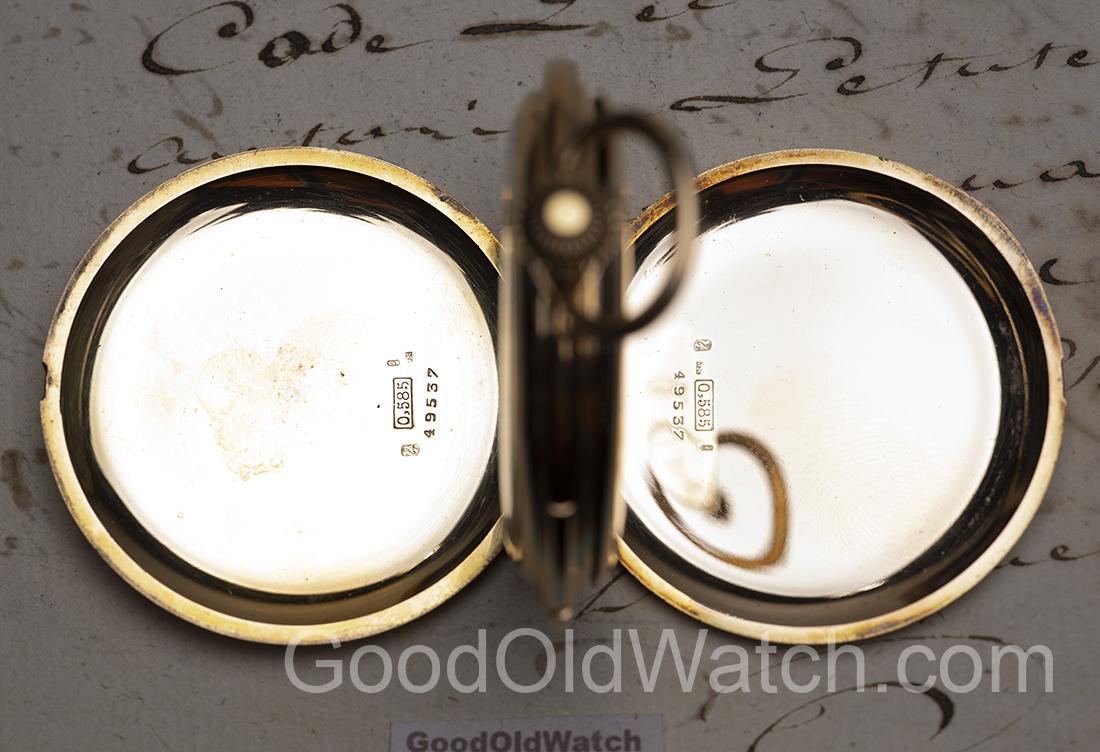 Watch case bears Swiss hallmarks for 14k gold, as well as JN maker's mark.