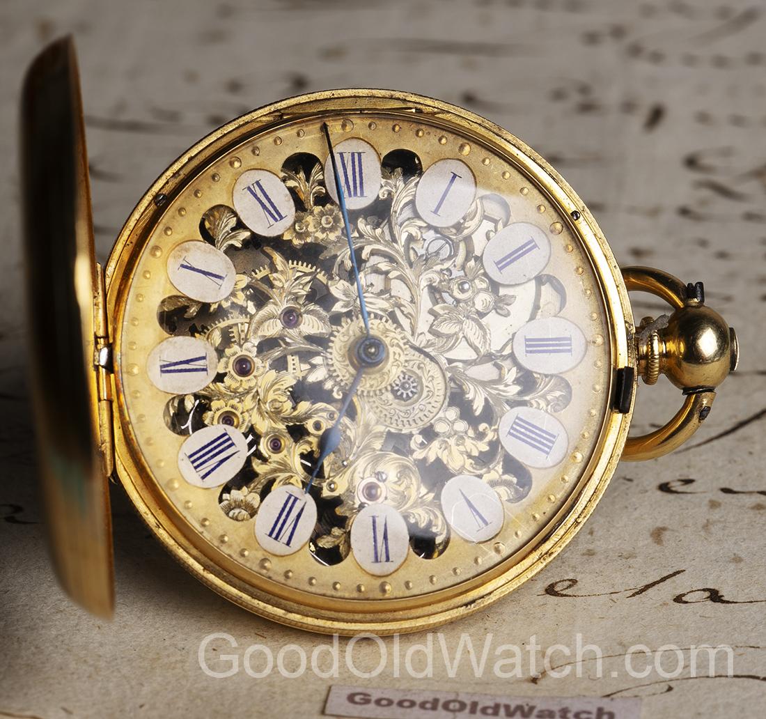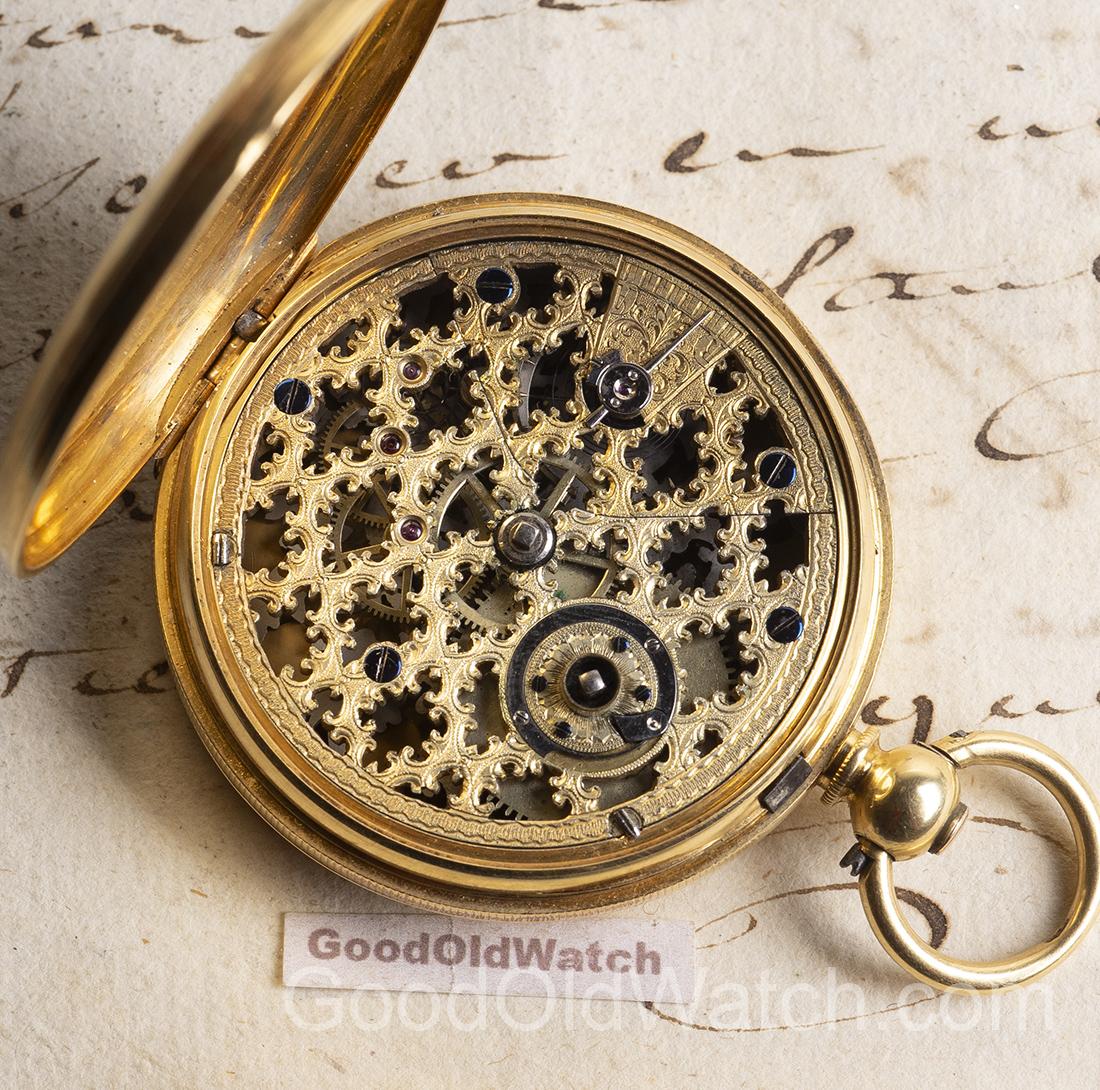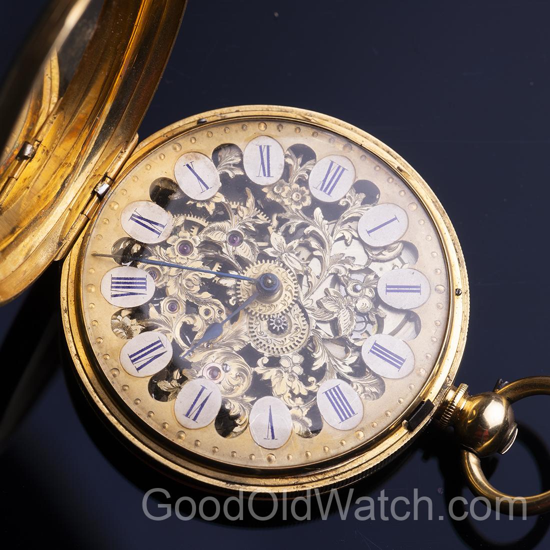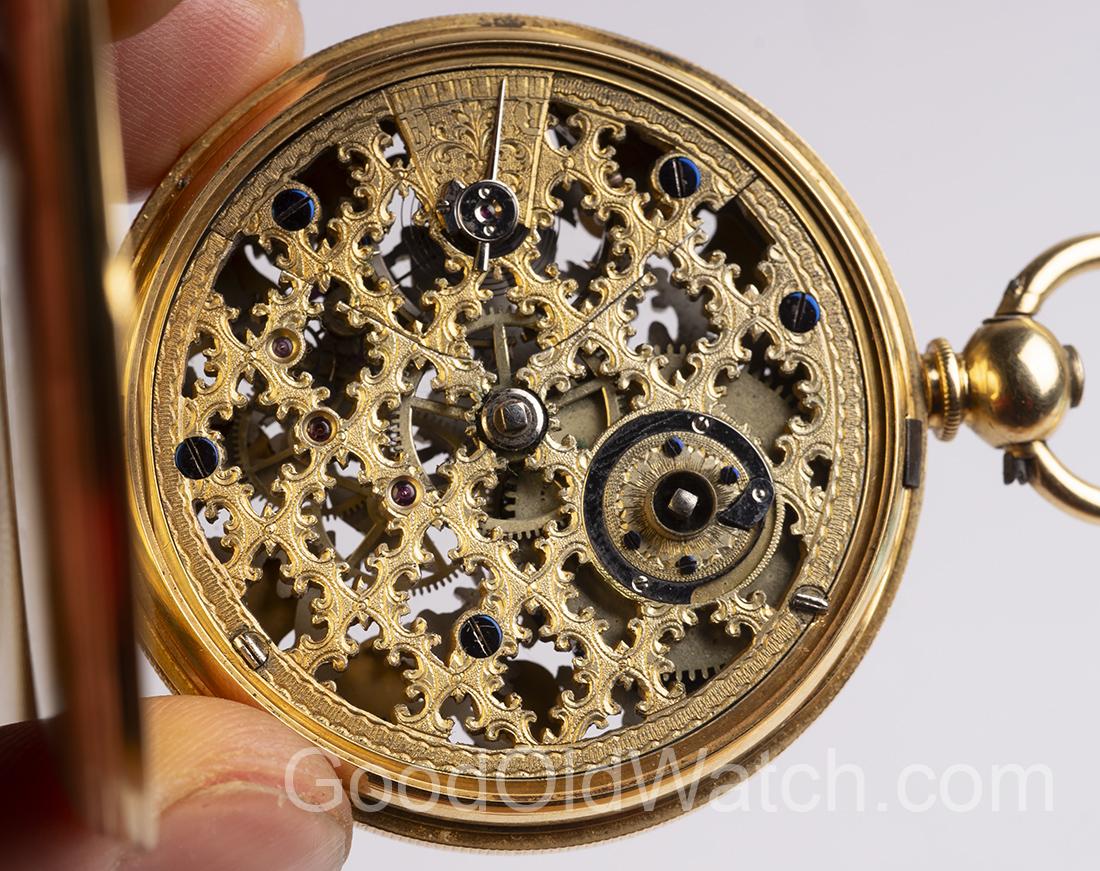 Rare skeletonized watch in 18k gold hunter case.