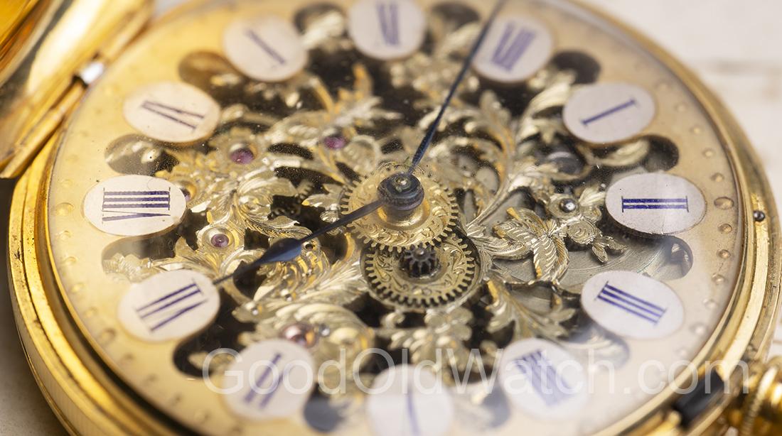 Unusually, both front and back plates are cut and pierced, forming partly transparent movement.