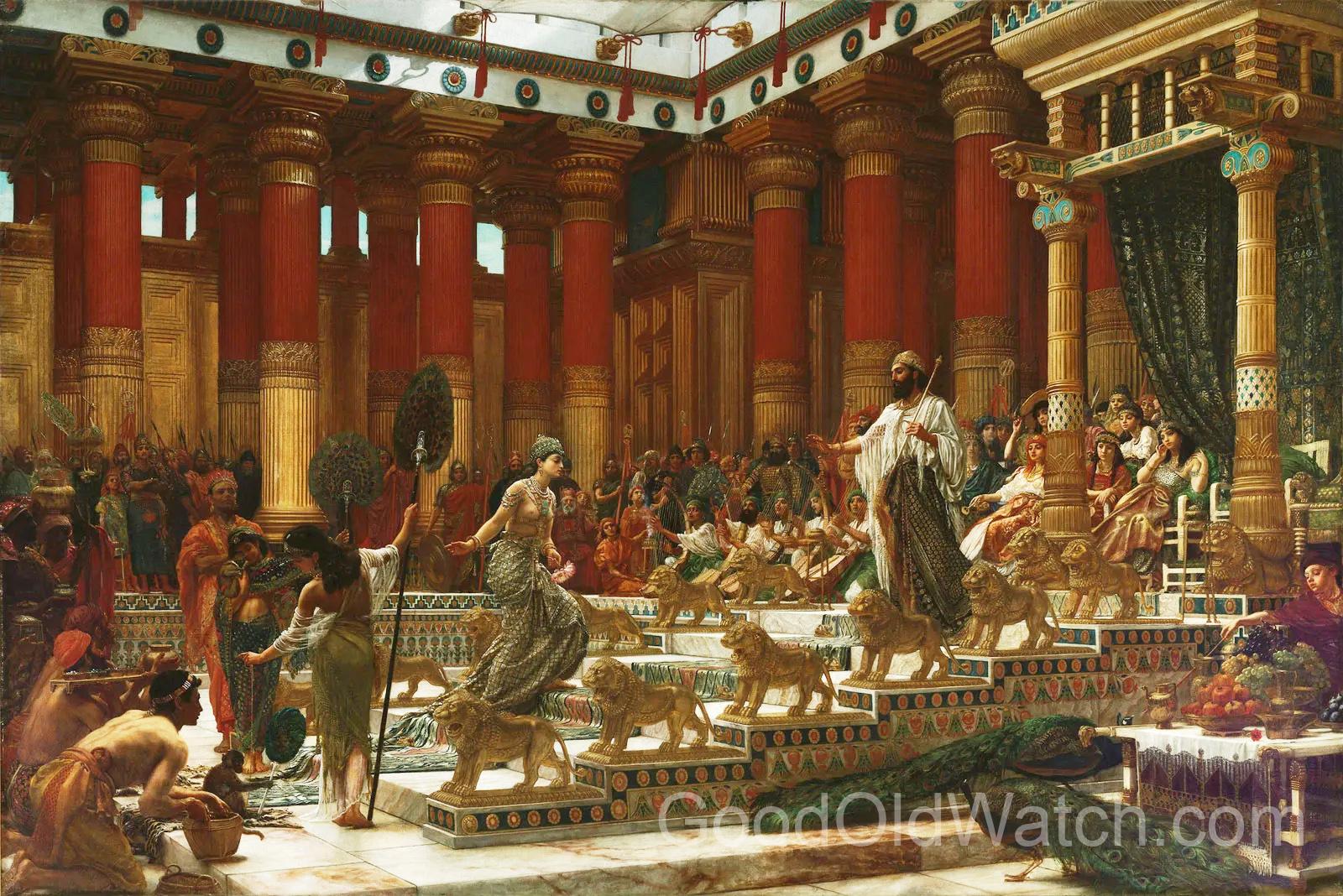 meeting of King Solomon and the Queen of Sheba. It could evoke Solomon’s wisdom, the magnificence of his court, and the arrival of a powerful and rich foreign queen bearing precious gifts. The scene likely carried a prestige meaning: wisdom, royal splendor, exotic wealth, diplomacy, and gift-giving.