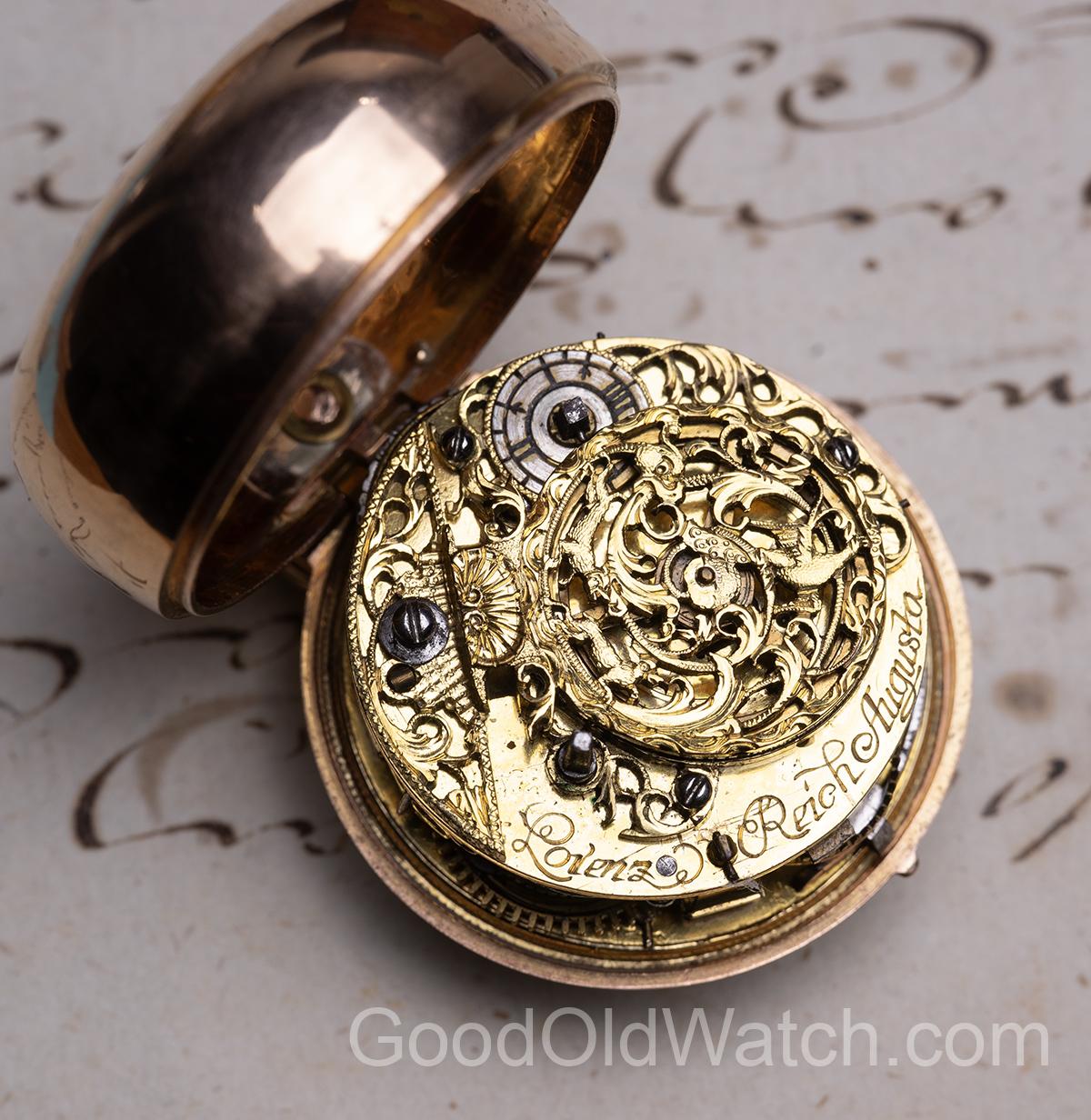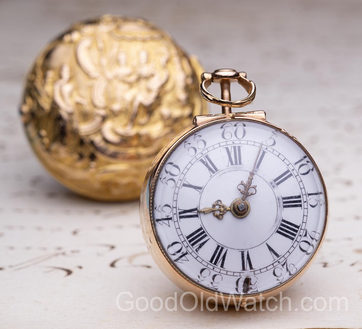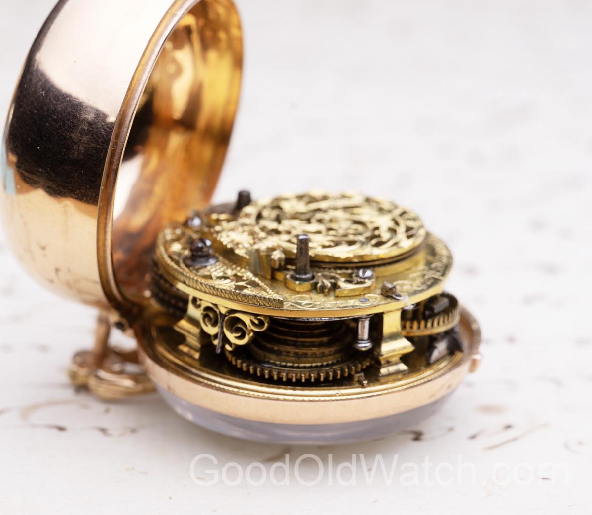Beautiful verge fusee watch in golden pair case.