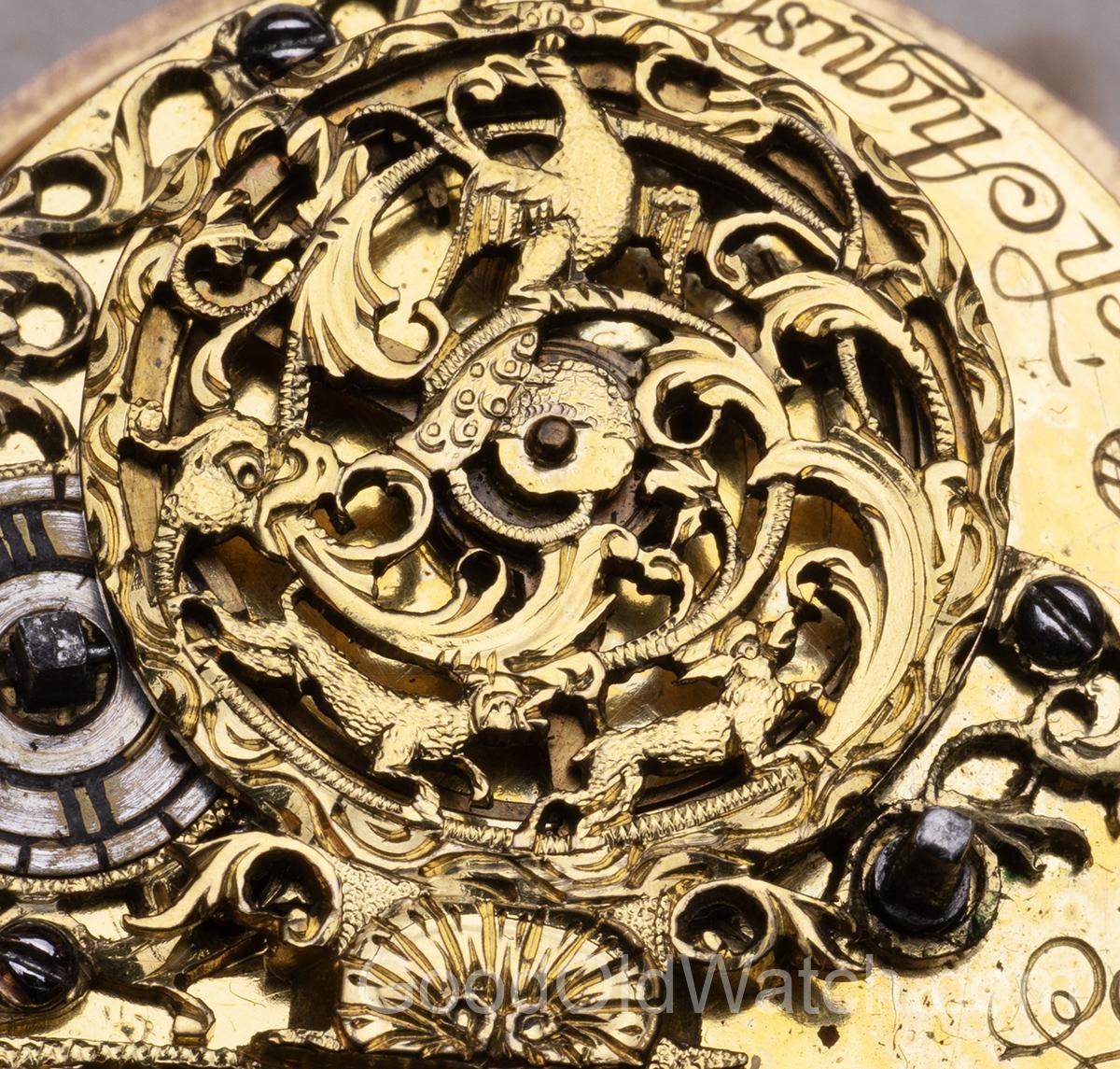 The watch features beautiful cock, decorated with bird and animal figures.