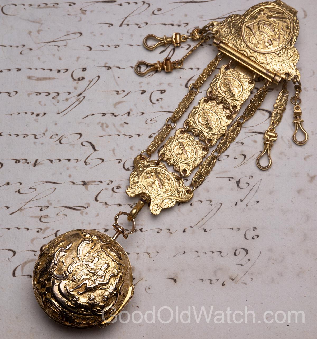 Watch comes with nice gilt baroque chatelain of 14 cm length.